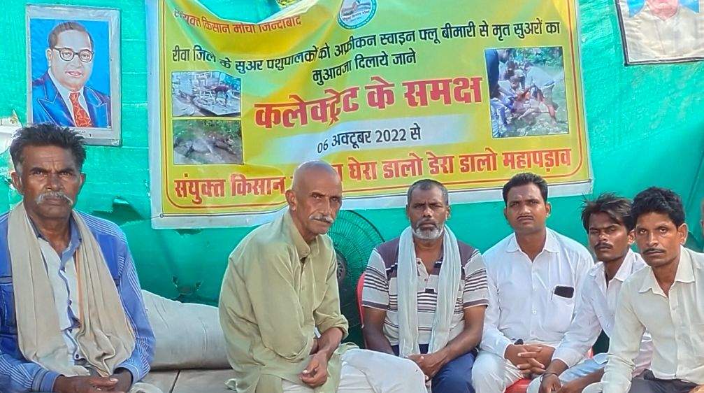 सुअर पशु पालकों को मृत सुअरो का मुआवजा दिलाए जाने के साथ-साथ पशु चिकित्सा विभाग के प्रमुखो के खिलाफ कार्यवाही किये जाने को लेकर संयुक्त किसान मोर्चा की अगुवाई पर बसोर समाज का कलेक्ट्रेट रीवा के समक्ष महापड़ाव 303वें दिन  रहा जारी मोर्चा के संयोजक शिव सिंह ने कहा सुअर पशुपालकों के आंदोलन के 10 माह पूरे हो चुके हैं लेकिन शिवराज की बेदर्द तानाशाह हुकूमत ने आज तक उनकी मांगों का निराकरण नहीं किया आंदोलनकारियों ने सरकार को खुली चुनौती देते हुए कहा कि यदि उनकी मांगों का निराकरण शीघ्र नहीं किया गया तो आने वाले चुनाव में परिणाम भुगतने पड़ेंगे महापड़ाव में समाज के प्रमुख प्रदीप बसोर शकोचिल प्रसाद बसोर राजाराम उर्फ राजा बसोर बाबूलाल बंसल पार्षद शंकरलाल मलखान बंसल गीता आदि आंदोलनकारी उपस्थित रहे आंदोलन में मोर्चे के नेता आदि शामिल हुए महापड़ाव स्थल पर लगातार लंगर जारी है